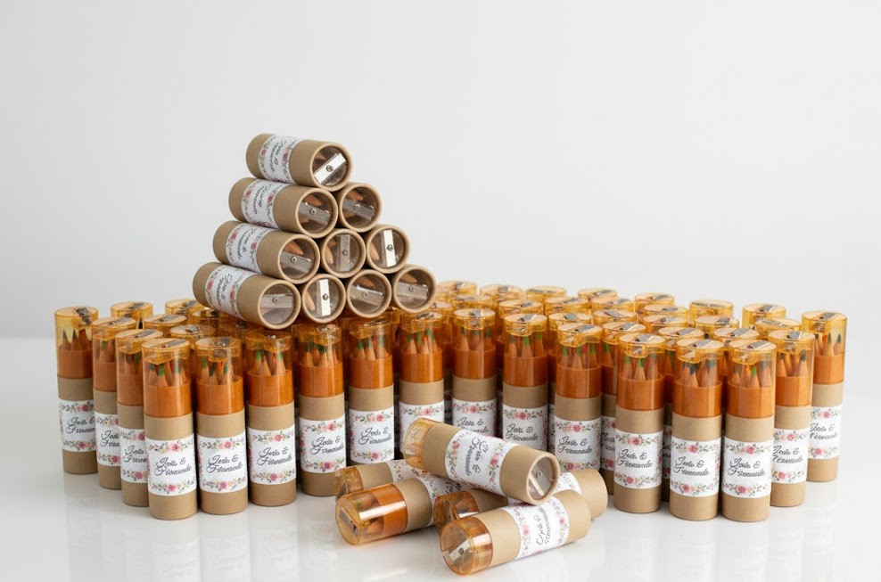 O nosso conjunto de 6 lápis de cor é a solução ideal para quem procura uma lembrança de evento que seja, simultaneamente, útil e memorável. Apresentado num tubo de cartão Kraft sustentável, este brinde combina um design rústico com a elegância da personalização exclusiva para o dia de Inês & Fernando.